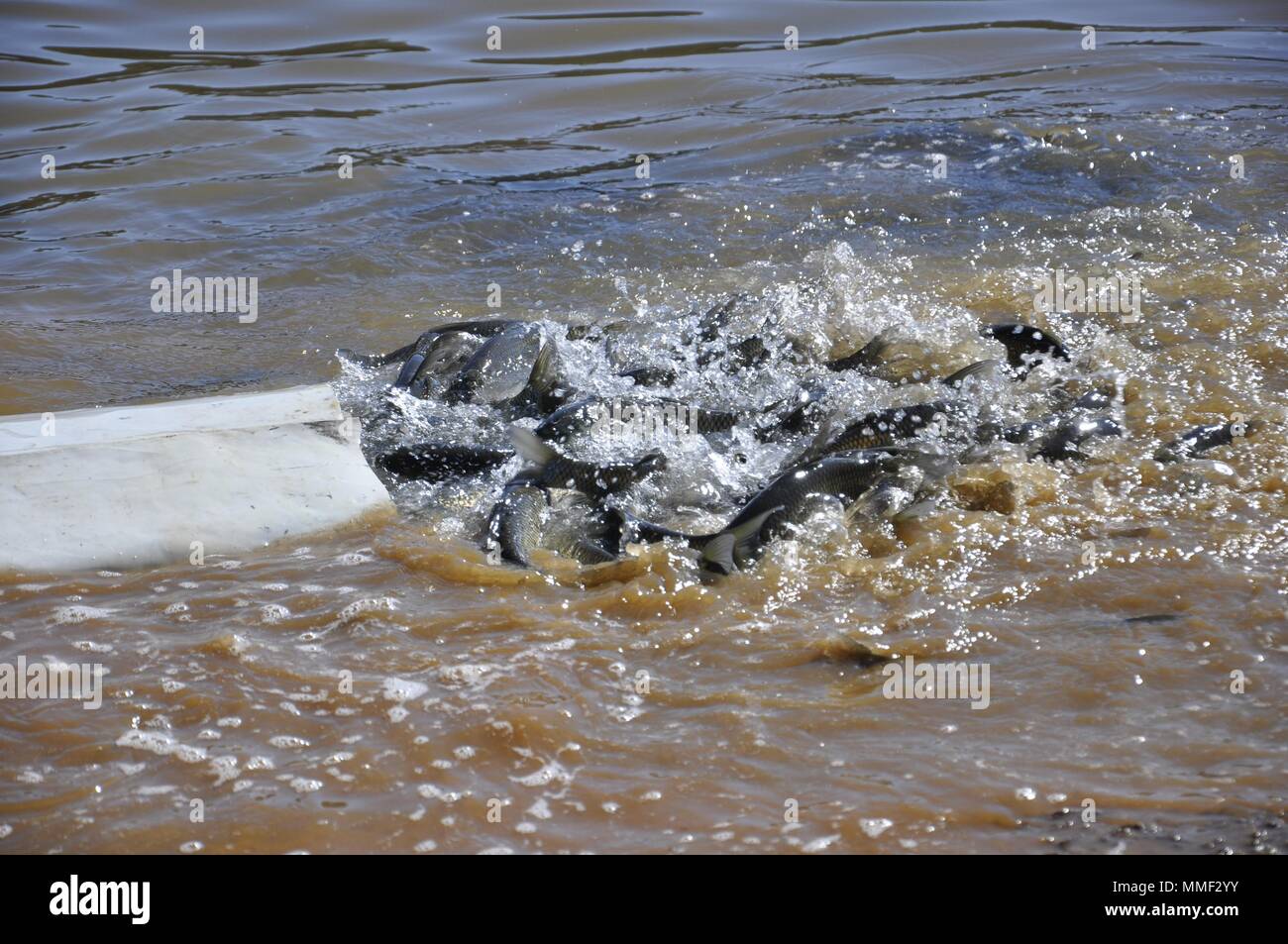 Workers With Name Of Organization Or Company Release The First Batch Of More Than 17 000 Sterile Grass Eating Carp Into The J Strom Thurmond Lake Near Augusta Georgia Oct 25 2017 The Fish
